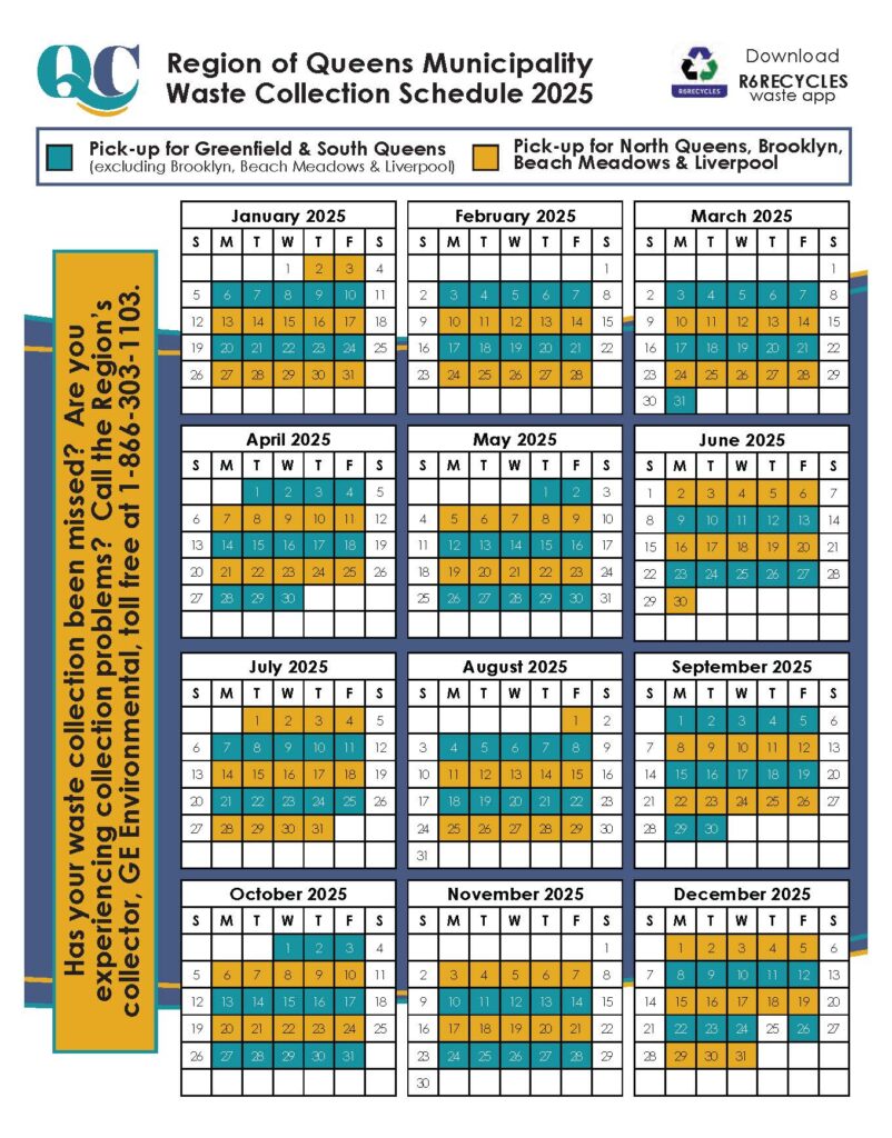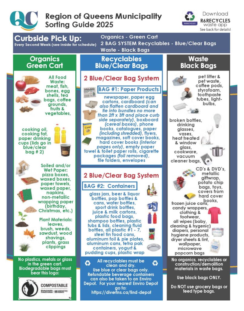 In the Region of Queens, [household] waste collection is every second week as indicated on your 2025 Waste Collection Schedule. Green carts, blue bags and garbage (black) bags are picked up on the same day.