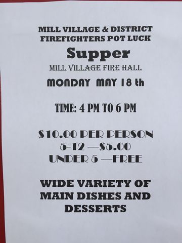 Events Firefighter’s Pot Luck Supper 18May2015 Mill VillageFrom 4pm to 6pmMill Village Fire Hall39 Medway River Road, Mill Village, NSAdults: $10.--Children 5-12: $5.--