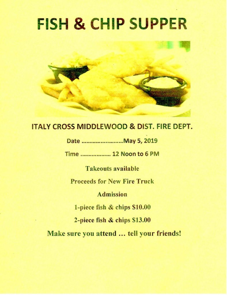 Events Fish & Chips Supper – Italy Cross, 5-May-2019 05May2019 Italy CrossFrom 12pm to 6pmItaly Cross Fire Hall17722 Hwy103, Italy Cross, NShttp://italycrossfire.ca/$10.-- / $13.--Sunday, 3-May-2019 / 12pm to 6pm
