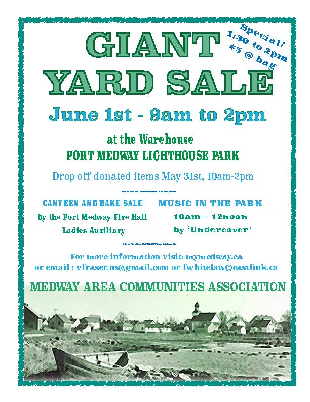 Events MACA Yard Sale – Port Medway, 1-Jun-2019 01Jun2019 Port MedwayFrom 9am to 2pmPort Medway Lighthouse Park1677 Port Medway Rd, Port Medway, NShttp://mymedway.caSaturday, 1-Jun-2019 / 9am to 2pm