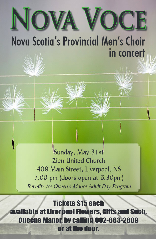 Events Nova Scotia’s Provincial Men’s Choir in Concert 31May2015 LiverpoolFrom 7pmZion United Church409 Main St, Liverpool, NShttp://www.novavoce.com$15.--