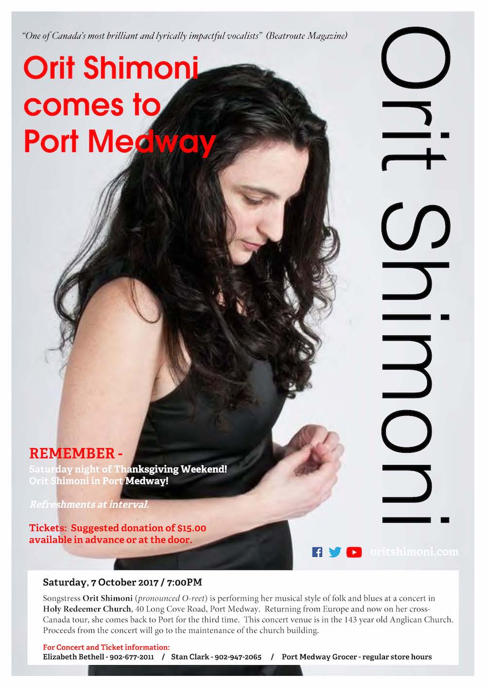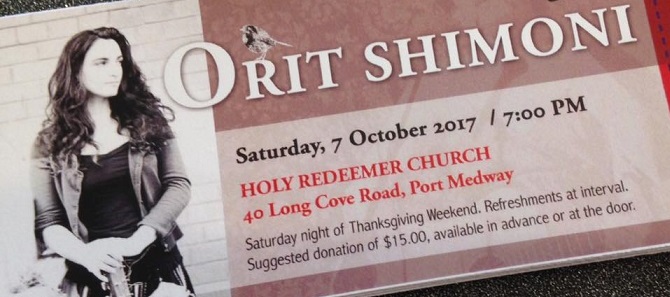 Events Orit Shimoni in Concert – Port Medway, 7-Oct-2017 07Oct2017 From 7pmHoly Redeemer Church40 Long Cove Rd, Port Medway, NSSaturday, 7-Oct-2017 / 7pm Check this video invitation: https://youtu.be/7MeSSSm4meA