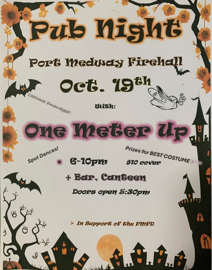 Events Halloween Pub Night @ PMFD – Port Medway, 19-Oct-2024 19Oct2024 Port MedwayFrom 6pm to 10pmPort Medway Fire Hall66 Long Cove Rd, Port Medway, NSCover charge: $10Saturday, 19-Oct-2024 / 6pm to 10pm One Meter Up Dress up for the fun!