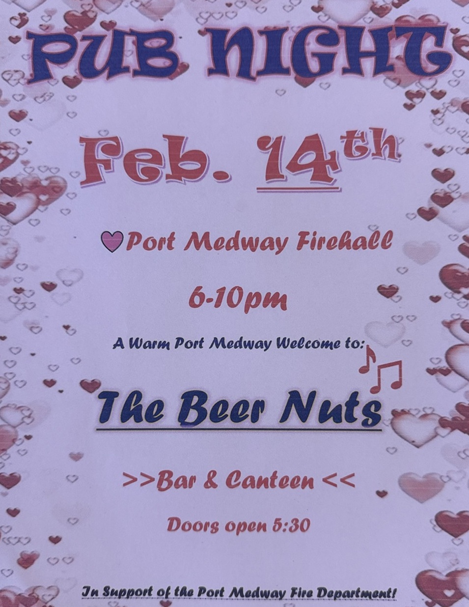 Events Pub Night @ PMFD – Port Medway, 14-Feb-2026 14Feb2026 Port MedwayFrom 6pm to 10pmPort Medway Fire Hall66 Long Cove Rd, Port Medway, NSCover charge: $10Saturday, 14-Feb-2026 / 6pm to 10pm w/The Beer Nuts