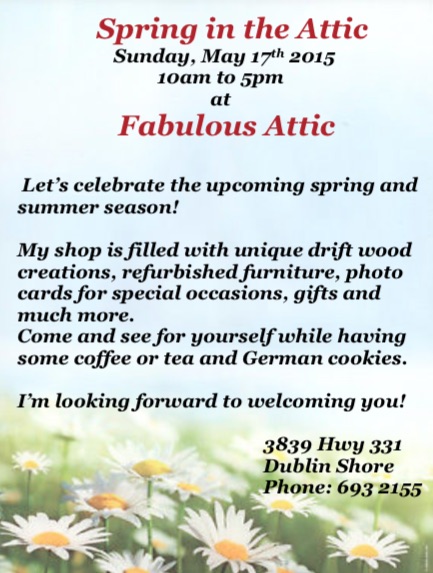 Calendar Spring in the Attic 17May2015 Dublin ShoreFrom 10am to 5pmFabulous Attic3839 Hwy 331, Dublin Shore, NS