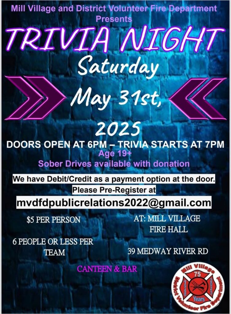 Events Trivia Night – Mill Village, 31-May-2025 31May2025 Mill VillageFrom 7pmMill Village Fire Hall39 Medway River Road, Mill Village, NS$5.--/personSaturday, 31-May-2025 / 6pm