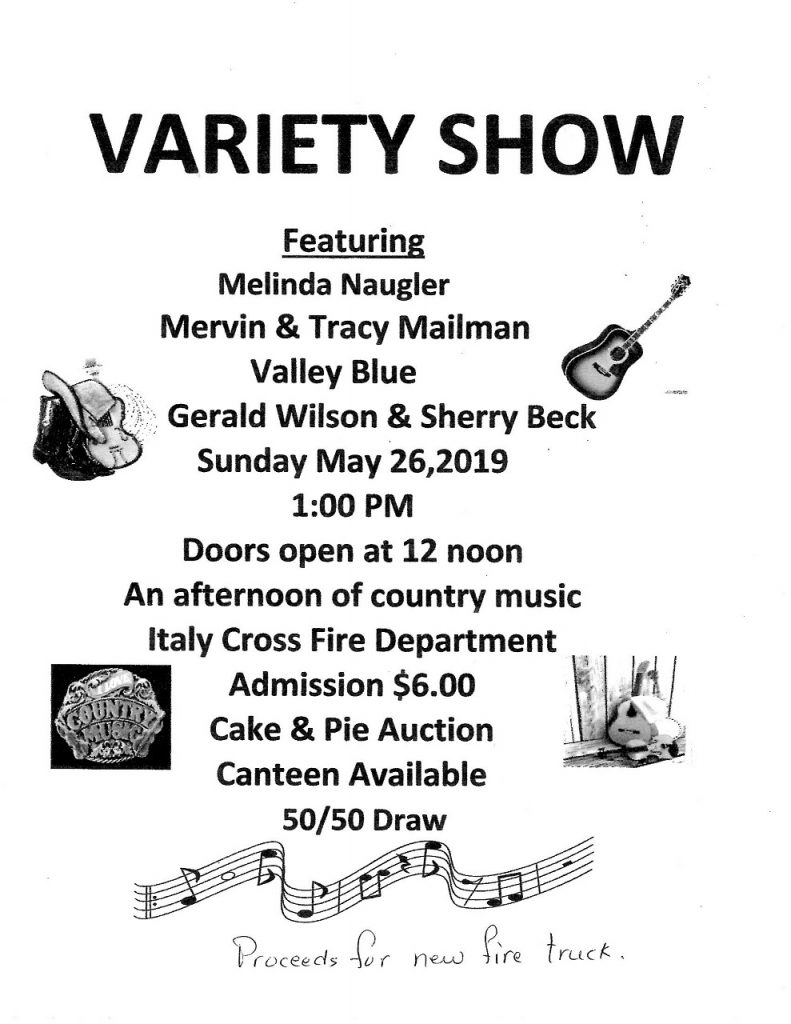 Events Variety Show – Italy Cross, 26-May-2019 26May2019 Italy CrossFrom 1pmItaly Cross Fire Hall17722 Hwy103, Italy Cross, NShttp://italycrossfire.ca/$6.--Sunday, 26-May-2019 / 1pm