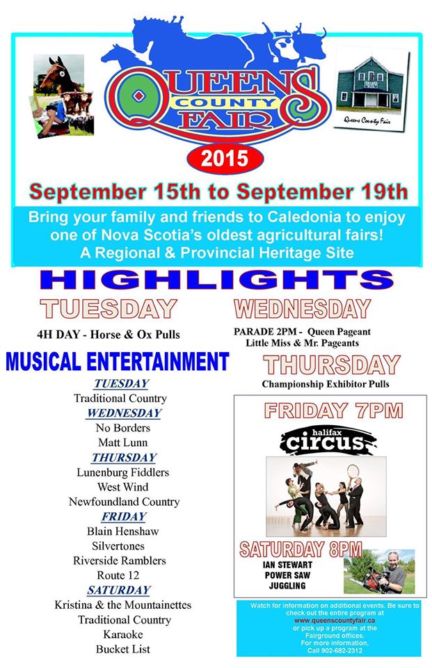 [©2015 novascotia.ca] The annual Queens County Fair runs for five days from 15-Sep to 19-Sep-2015 with Draft Horse Show Classes and Pulls, Oxen Classes and Pulls with log yarding competitions and a relay race for the oxen.