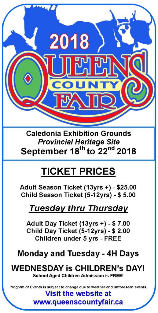 The annual Queens County Fair runs for five days from 18-Sep to 22-Sep-2018 with Draft Horse Show Classes and Pulls, Oxen Classes and Pulls with log yarding competitions and a relay race for the oxen.
